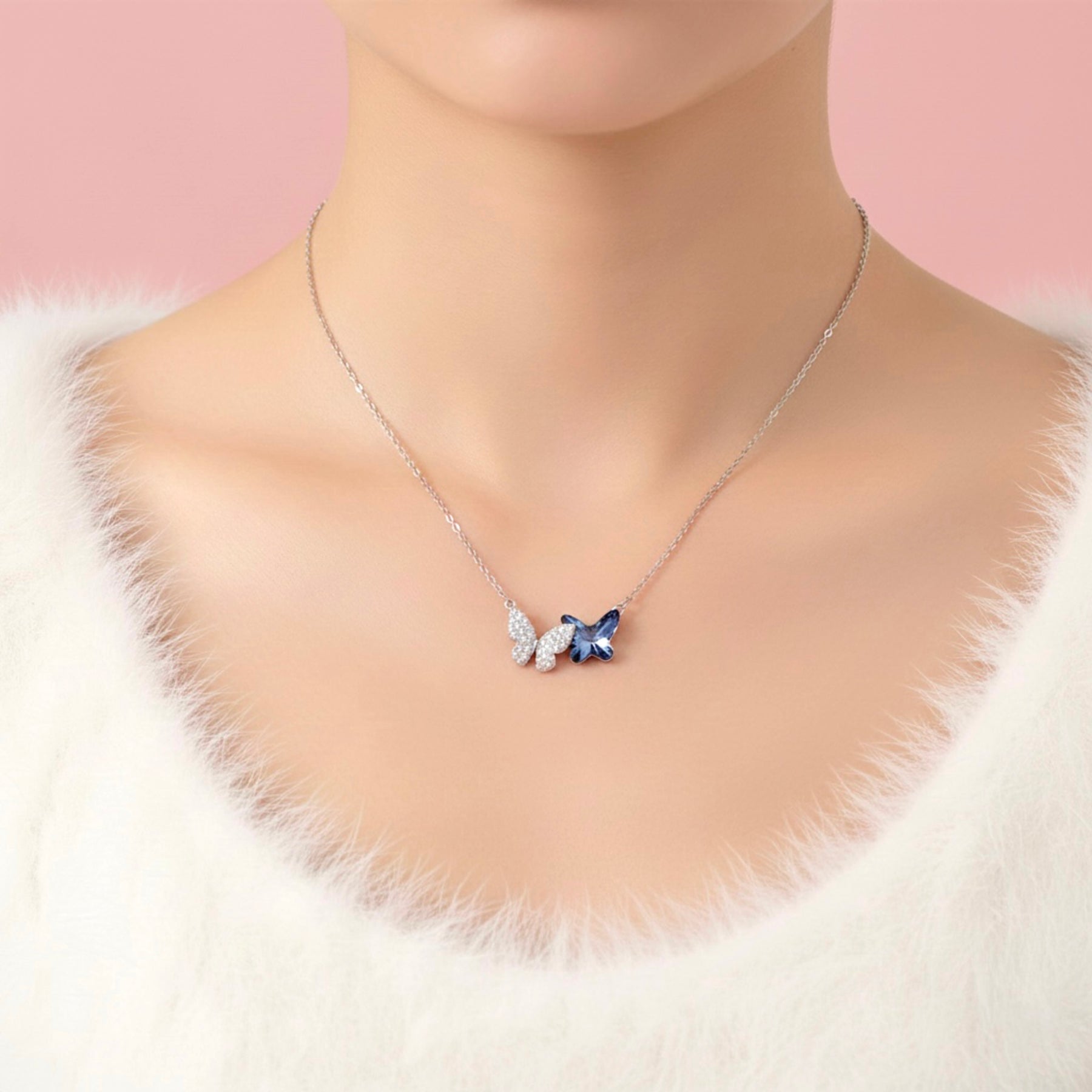 This 925 sterling silver necklace features two delicate butterflies in shimmering silver and soft blue, symbolizing harmony, transformation, and gentle connection. Light, graceful, and quietly enchanting, the design captures a sense of freedom and elegance that feels both timeless and meaningful.