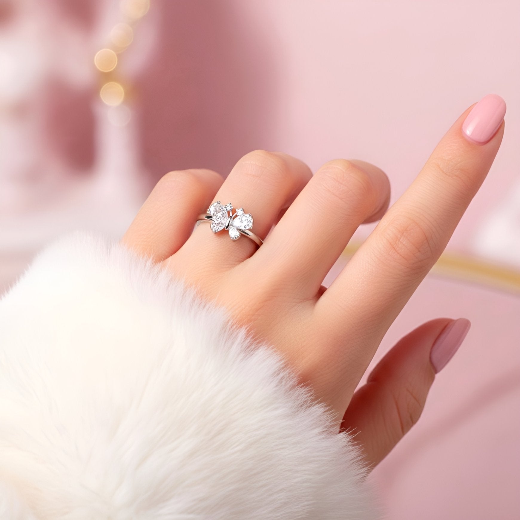 Our white "Iced Butterfly" diamond-simulated ring features a delicate butterfly-shaped center stones and symbolizes luxury and beauty. Made from premium materials, it effortlessly captures the essence of femininity, making it a versatile accessory for every occasion.