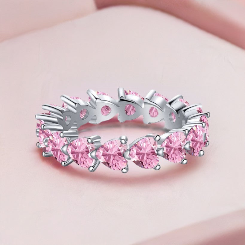 Our "Eternal Rose" ring is such an engaging ornament, with its infinite pink hearts halo effect, it can beautify any look. One glance is enough to completely fall in love with this rare color of pink. Extremely perfect to be decorated with any other ring, it's THE jewel everyone needs!