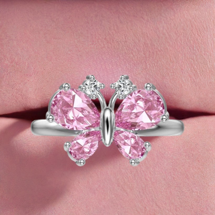 Our pink "Iced Butterfly" diamond-simulated ring features a delicate butterfly-shaped center stones and symbolizes luxury and beauty. Made from premium materials, it effortlessly captures the essence of femininity, making it a versatile accessory for every occasion.